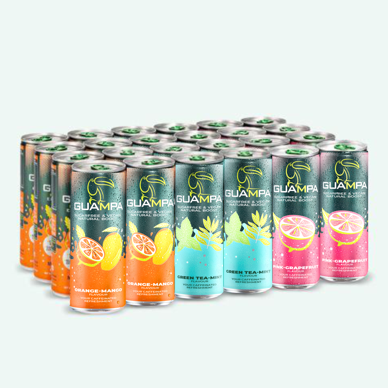 8 cans each of pink grapefruit, green tea mint and orange mango are represented in this tray of 24.